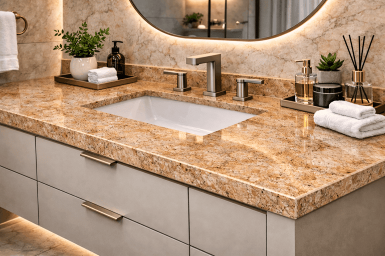 Canyon Gold Granite is highly durable, resistant to heat, scratches, and weather conditions, making it suitable for a wide range of interior and exterior applications. It is commonly used for kitchen countertops, flooring, wall cladding, staircases, bathroom vanities, and decorative architectural features.