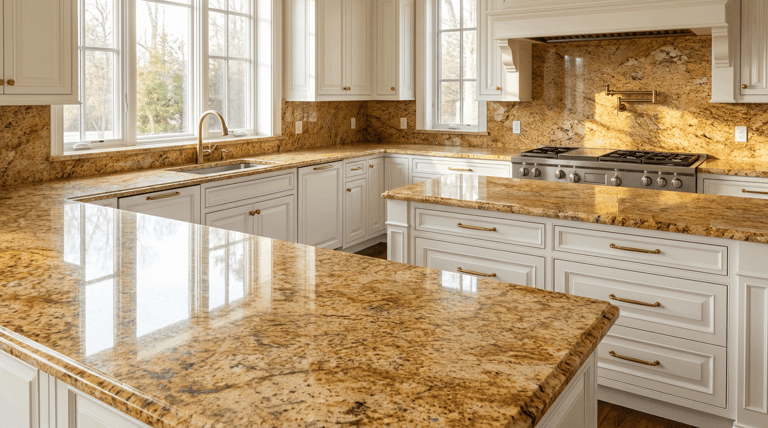 Fusion Gold Granite is a beautiful natural stone from South India, known for its rich golden background with flowing brown and grey patterns. Its elegant look makes it suitable for both residential and commercial applications.